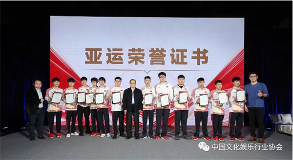 获得“亚运荣誉证书”的是英雄联盟项目中国团队 姬星、 苏汉伟、田野、简自豪、刘世宇、史森明、严君泽;王者荣耀国际版(AoV)中国团队 李托、张宇辰、王添龙、刘明杰、潘佳冬、向阳、谢涛;皇室战争中国团队 黄成辉。