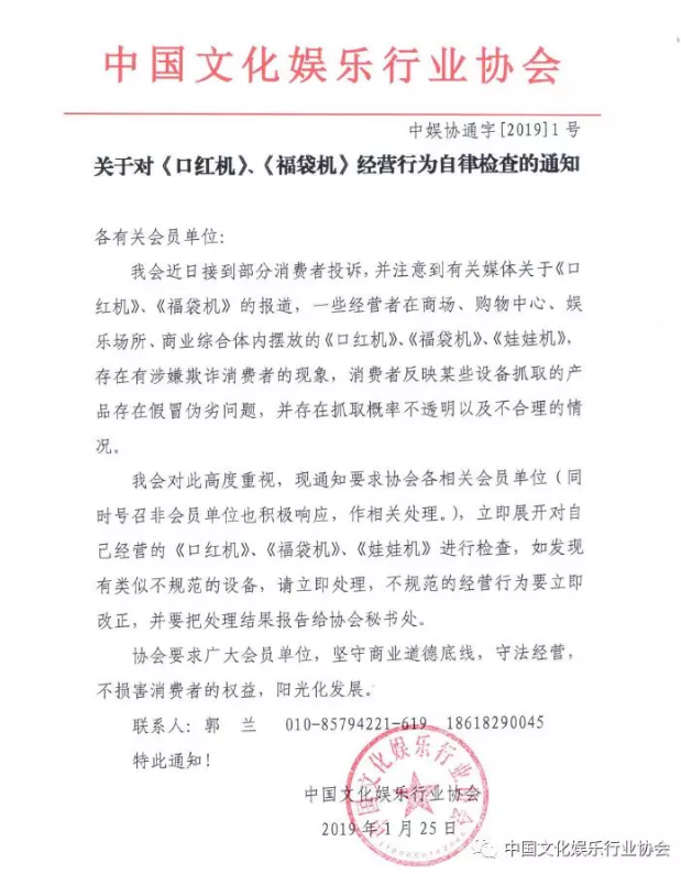 关于对《口红机》、《福袋机》经营行为自律检查的通知